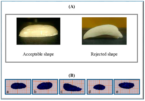 (A) Criteria for selection of peanut kernels for the compression test; (B) a–e represent 5 marks left by 5 different. peanuts on the graph paper, (5 repetitions of the third run).
