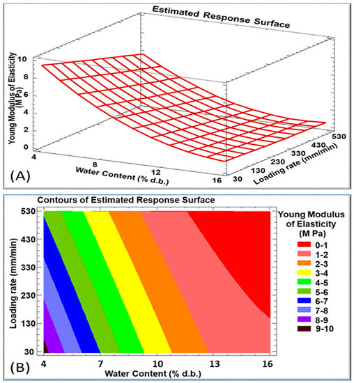 The response surface of Young’s modulus of elasticity is presented in Figure 6A for different values of water content and loading rate. The estimated responses largely corroborate those found in the literature. In a study published in 2004, Demir and Cronin [56] came up with an elasticity modulus of 4.26 ± 0.889 MPa for raw hazelnuts and 4.93 ± 3.03 MPa for roasted ones. Knowing that the ideal water content of roasted nuts is around 1.5–3% d.b. [57], it is logical that the studied raw peanuts having 4.6% d.b. as average water content would have a Young’s modulus of 6.73 ± 0.37 MPa (trial 5, Table 3). Once peanuts are hydrated, this elasticity modulus will decrease to reach a minimum value of 0.29 MPa for approximately 20% d.b. water content (Figure 6A).