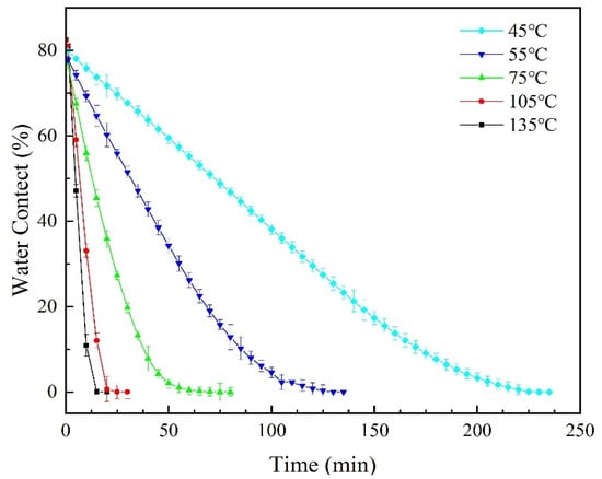 Taking a thin municipal sludge layer with a thickness of 2 mm as an example, its moisture content changes over time at 45 °C, 55 °C, 75 °C, 105 °C, and 135 °C, as shown in the figure below.