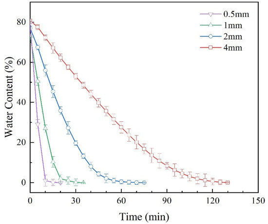 Taking the thin sludge layer with a drying temperature of 75 °C as an example, its moisture content changes over time under the four thicknesses of 0.5 mm, 1 mm, 2 mm, and 4 mm, as shown in the figure below.