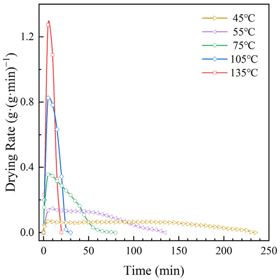 Taking the 2 mm thin sludge layer as an example, its drying rate changes over time at 45 °C, 55 °C, 75 °C, 105 °C, and 135 °C, as shown in the figure below.