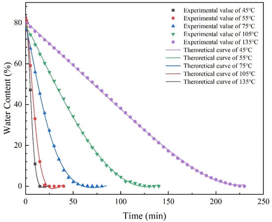 It can be seen from Table 2 above that the correlation coefficients R2 of the Logarithmic Model all exceed 0.99 under the medium temperature drying condition of 105–135 °C. The standard deviation (SD), Chi-square (χ2), and residual square (RSS) were also the smallest in all models. It shows that the Logarithmic model is more suitable to describe the change of drying water content and time prediction of thin municipal sludge layer in the range of 105–135 °C. Under low-temperature drying conditions (45~75 °C), R2 of the Midilli model was more than 0.99, and standard deviation (SD), Chi-square (χ2), and residual square (RSS) were the smallest among all models. The results show that the Midilli model is more suitable to describe the variation of drying water content and the prediction of drying time of thin municipal sludge layer at 45–75 °C.