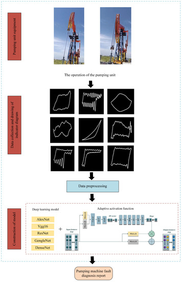 The traditional method for fault diagnosis of a pumping unit is to measure the load change with displacement at the suspension point, draw the suspension point indicator diagram, and then diagnose the working condition of the pumping unit according to the shape of the indicator diagram. The disadvantages of the traditional method are as follows: first, the fault of the pumping unit is judged mainly by the method of manual identification of indicator diagram, which has a great influence on human factors and low recognition accuracy. Secondly, due to the large number and wide distribution of pumped wells, manual detection of faults is time-consuming and laborious. However, given the complexity and high cost of pump units, there is less tolerance for performance degradation, productivity decrease, and safety hazards; therefore, it is necessary to detect and identify all potential faults rapidly [4,5]. This means that it is imperative to replace the manual fault diagnosis of the pumping unit with a computer.