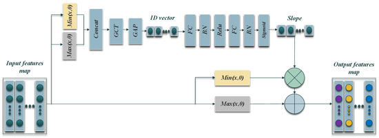 The structure of adaptive activation functions is shown in Figure 4. The input of the subnetwork is concatenated by the one-dimensional vector obtained from the two inputs. The two inputs are positive features after separation and negative features after separation. The separation of positive and negative features can highlight the key features. The following calculation paths are GCT→GAP→FC→ Batch Normalization(BN)→ ReLU→ FC→ BN→ Sigmoid →Scales. The function of each layer is described in the following section.