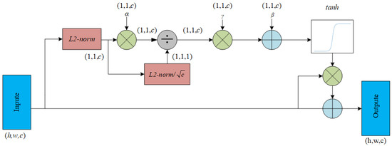 GCT combines normalization methods and attention mechanisms, which makes it easy to analyze the relationships (competition or cooperation) between channels. As shown in Figure 5, the GCT module introduces three trainable parameters , , and to evaluate the communication channels. Among them, helps embed the output adaptive ability, while and are used to control the activation threshold, which determines the behavior of GCT in each channel. h and w are the dimensions of feature vectors, c is the number of channels, and L2-norm is the normalization of L2.