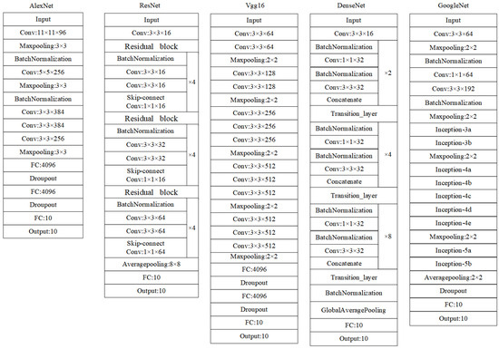 This section mainly verified the performance of our activation function, which was tested on AlexNet, VGG-16, GoogleNet, ResNet, and DenseNet. The structure diagrams of these five networks are shown in Figure 6. Moreover, we compared our activation function with the traditional activation functions such as ReLU, Sigmoid, Tanh, LReLU, and PReLU.