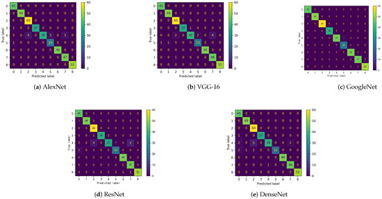 The confusion matrix is a common index and visualization tool to evaluate the results of the classification model, and it can judge the advantages and disadvantages of classifiers. The rows of the matrix represent the true value, and the columns of the matrix represent the predicted value. The confusion matrix can, respectively, count the number of the wrong classification and the right classification and then display the results in a matrix. Figure 7 shows the confusion matrix of the five models for the pumping unit fault data set. It can be seen that the designed adaptive activation function can effectively represent the mapping relationship between the displacement and the load in the indicator diagram and extract the features of the indicator diagram; thus, those indistinguishable samples are correctly classified. Taking GoogleNet as an example, the accuracy of each type of fault is given in Table 2, proving that the proposed adaptive activation function can improve the accuracy of each type of fault diagnosis.