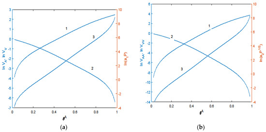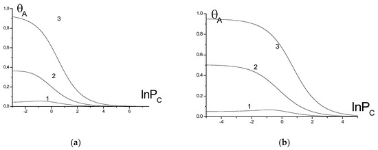 As a visual illustration, we present Figure 1, which shows the concentration factors of the rates for the four indicated stages and the equilibrium values θA corresponding to the equalities of the rates of the stages for chemisorption (εAA < 0), without dissociation (Figure 1a) and in the presence of dissociation (Figure 1b). Here, Vi = Ui/Ki, Vii = Uii/Kii. Each field consists of three curves for the logarithm of the concentration factors for rates of non-dissociative (Figure 1a) and dissociative desorption (Figure 1b), adsorption (curve 1), desorption (curve 2), and the logarithm of the isotherm of adsorption (curve 3, right y-axis). As in ideal systems (Section 3.2), both curves 3 are identical for non-ideal systems.