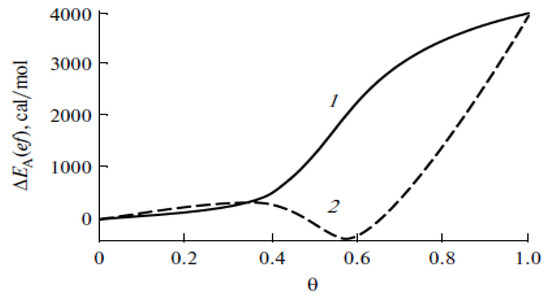 The effective activation energy of desorption (), and accordingly the reaction rate, increases monotonically with increasing surface coverage when calculated by Equation (A6) for the unimolecular stage with the function (3) (this stage is fast without taking into account environment relaxation). When calculated by the Formula (9) for the unimolecular stage [123], the effective activation energy for desorption under conditions of equilibrium relaxation of the environment (this stage is slow) varies nonmonotonically. The nonmonotonic behavior of the desorption rate contradicts the physics of the process, especially in view of the fact that, at short distances, chemisorbed species repel each other. In general, in non-ideal systems, the nonmonotonic behavior of the reaction rate is possible only if the potential is attractive [66,106,124]. Furthermore, the negative effective activation energy of the sole desorption reaction does not have a physical sense. The behavior of curve 2 is due to an incorrect procedure for averaging over all configurations of all neighbors with respect to the AC. This drastically changes Equation (3), in which the functions have a different relationship with the concentrations and functions tij. As a result of this averaging procedure, the nature of the effective interaction between particles changes: instead of repulsion, their effective attraction appears (which distorts the physical nature of the system). When the density of the system changes, the particles behave as in the case of a first-order phase transition with a nonmonotonic concentration dependence of the rate of the desorption stage.