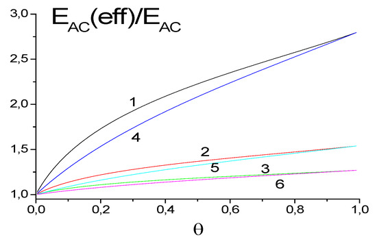 Equations (2) and (3) contain the pair function θij that characterizes the probability that two particles i and j can be on neighboring sites. The calculation of pair functions θij in non-ideal reaction systems is always carried out in some particular approximation because the problem cannot be solved exactly [64,65,66]. In this case, the so-called quasi-chemical approximation (QCA) is used [23,64,65,66]. Historically, it was the first approximation in which the effects of direct correlations between interacting molecules were taken into account. There, each pair of neighboring molecules is considered independent of other molecules in the system. The function θij depends on the interaction energy of molecules and concentrations of components.