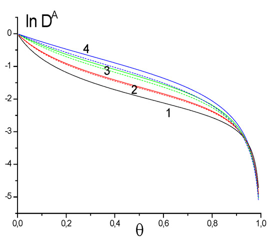 Intermolecular interactions change the probability of encounters of reagents (the factor θAB instead of the product θAθB) and the heights of activation barriers through the functions ΛfgAB. Functions Si take into account the influence of neighbors on the magnitude of activation barriers through the difference in interaction parameters due to the influence of the neighboring particle j (via ). The exponential factor with in Formula (2) is necessary for the transition at low system densities from Formula (4) to Expression (1) for the law of mass action, as for an ideal system [66].