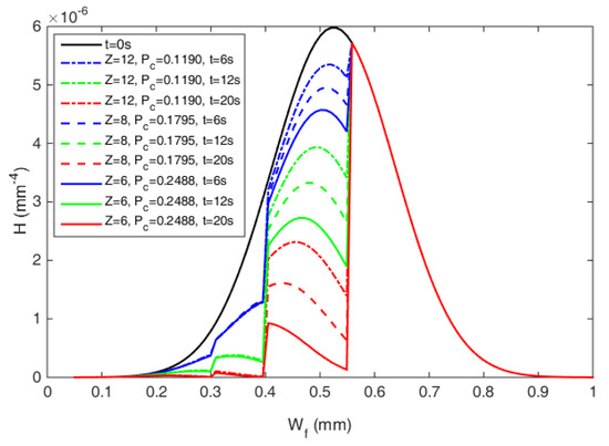 The parameters which characterize the fracture network connectivity mainly include coordination number Z and percolation threshold pc. Their impacts on the flow and retention behaviors of multi-sized suspended granule are presented in Figure 12, Figure 13, Figure 14 and Figure 15. Larger Z and smaller pc improve the connectivity of the fracture network. Figure 12 presents the variation of retained granule concentration for multi-sized granules capture in fracture network with different connectivity. Retained granule concentration declines with the network connectivity increase. The reason is that lower fracture network connectivity yields higher granule path tortuosity, which leads to higher probability for the granules to come into the smaller aperture fractures (af < ds) and be retained (Figure 13). Therefore, a higher fracture network connectivity also results in lower decline of fracture permeability as well as fracture density because of lesser retained granule concentration during the transport of multi-sized suspended granule (Figure 14 and Figure 15).