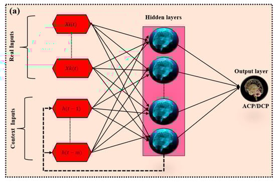 As recurrent computational learning, ENN is a type of machine learning technique that uses feedback connections to retain information about previous inputs. It comprises different three layers (as presented in Figure 2a) similar to traditional neural networks with the hidden layer having additional connections to itself from the previous time step [29]. This allows the network to capture sequential information and make predictions based on past inputs. The network is trained using backpropagation through time, where the error is propagated through the network and the weights are updated accordingly [30]. The ENN has been used for numerous purposes, both in science and engineering problems [31,32].