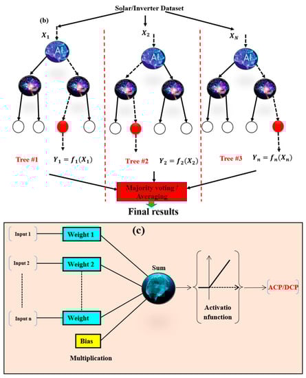 According to the “no free lunch” theorem, there is no single model that is universally better than all other models for every type of problem. In other words, there is no one-size-fits-all model that can provide optimal results across all possible scenarios [28]. In this work, we proposed several AI learning based on three different scenarios (cropland, pasture, and cropland and pasture) to estimate the DCP and ACP based on solar panels and inverters, respectively. For this purpose, ENN, BTA, MLP, and GPR models are utilized. The proposed modeling schematics are presented in Figure 1. It is essential to consider the specific characteristics of the problem at hand, such as the nature of the data, the size of the dataset, and the goals of the analysis. Different models have different strengths and weaknesses, and what works well for one problem may not work as well for another. Therefore, it is important to experiment with different models and choose the one that is best suited for the particular task at hand [23]. As such, we developed several model combinations based on the influencing factors (see Figure 2) and existing claims of dominancy in the literature [24,25,26,27] as follows: