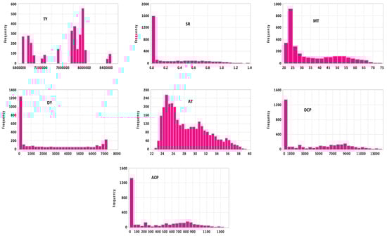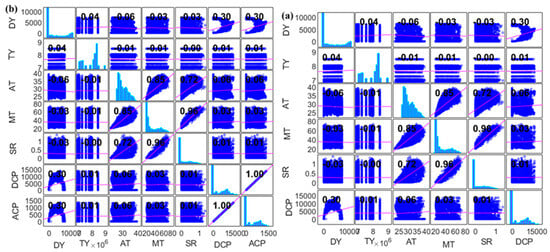 The table presents descriptive statistics for six parameters: DY, TY, AT, MT, SR, DCP, and ACP. The Kurtosis column represents the peak of the distribution, with a negative value indicating a flatter distribution than a normal distribution and a positive value indicating a more peaked distribution. The Skewness column shows the degree of asymmetry in the distribution, with a negative value indicating a left-skewed distribution and a positive value indicating a right-skewed distribution. The parameter TY has a Mean of 7,620,392.92 and an SD of 451,795.89, indicating that the data has a relatively high degree of variability. The Kurtosis value of −1.05 suggests that the distribution is relatively flat compared to a normal distribution. The Skewness value of −0.45 suggests that the data is slightly left-skewed. Finally, the Minimum and Maximum values of 6,870,716.67 and 8,460,553.49, respectively, show the range of observed values for the parameter. Similarly, the parameter with the lowest Kurtosis value is ACP with −1.21, while the parameter with the highest Kurtosis value is SR with −0.21. The parameter with the highest range of values is DCP with a range of 13,687.94, while the parameter with the lowest range of values is SR with a range of 1.36. According to [44,45,46,47,48], the lowest skewness towards negative values indicated the feasibility of AI-based learning in modeling the data accurately. The corroplot (as displayed in Figure 4) was used for the input combination in this study. It can be seen that the system is a highly stochastic approach based on the magnitude in Figure 4.