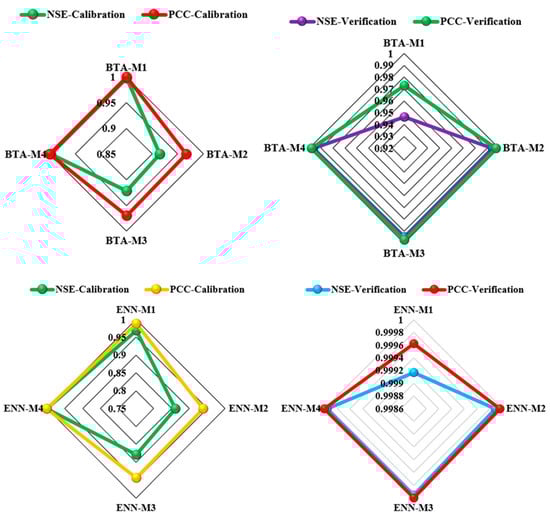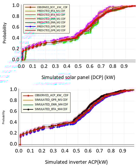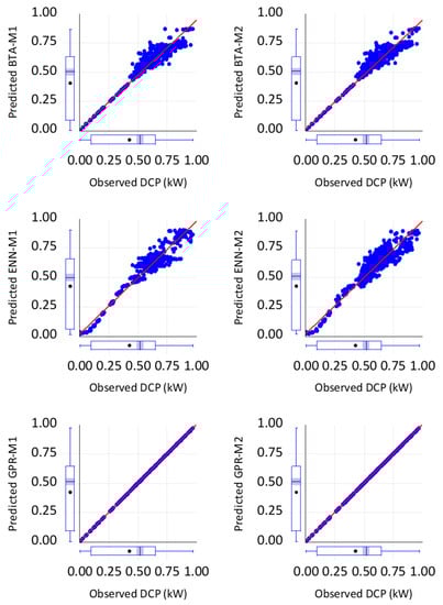 The verification result of DCP, as displayed in Table 2, also indicated that BTA-M1 and BTA-M2 exhibit excellent performance during the verification phase, with NSE values of 0.969 for both models, indicating a high degree of agreement between the observed and predicted values. They also have high PCC values of 0.989 for both models, indicating a strong linear relationship between the observed and predicted values. Furthermore, BTA-M1 and BTA-M2 have low RMSE values of 0.049 and 0.048, respectively, indicating a lower overall error compared to other models. Moreover, they have the lowest MAPE and MAE values, indicating a smaller percentage and average difference between the predicted and observed values. The ENN-M1 and ENN-M2 exhibit relatively good performance, with NSE values of 0.968 and 0.966, respectively, indicating a good agreement between the observed and predicted values. They also have high PCC values of 0.985 and 0.984, indicating a strong linear relationship between the observed and predicted values. However, they have relatively high RMSE values of 0.051 and 0.053, respectively, indicating a higher overall error compared to BTA-M1 and BTA-M2. In addition, they have a negative PBIAS value, indicating a tendency to underpredict the observed values. This conclusion was in line with the work conducted in [51], which suggests a method based on Decision Trees with a Light Gradient Boosting algorithm (DT-LGB) to analyze power data and predict faults for the maintenance of solar power plants. The results of this work showed that the suggested model obtained MSE = 8.74, RMSE = 2, and R2 values of 0.9939, which is 12.8%, 6.8%, and 11.08% improved than the existing method, respectively.
