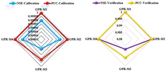 Similarly, the table provides a quick way to compare and evaluate the performance of different models in the verification phase, but it is important to consider the context and purpose of the models before drawing conclusions based solely on the metrics presented. The numerical comparison of the models based on these metrics indicated that the models with the highest NSE are ENN-M2, ENN-M3, ENN-M4, GPR-M1, GPR-M2, and GPR-M4, all with a perfect score of 1. The model with the lowest NSE is GPR-M3 with a score of 0.988. While the models with the highest PCC are ENN-M2, ENN-M3, ENN-M4, GPR-M1, GPR-M2, and GPR-M4, all with a perfect score of 1. The model with the lowest PCC is BTA-M1 with a score of 0.973. The model with the lowest RMSE is BTA-M4 with a score of 0.02. The model with the highest RMSE is GPR-M3 with a score of 68.185. According to [53,54,55], MAPE values are good when they are below or equal to 10%. The model with the lowest MAPE is ENN-M4 with a score of 0.506%. The model with the highest MAPE is BTA-M1 with a score of 10.091%. Similarly, the model with the lowest MAE is BTA-M4 with a score of 0.013. The model with the highest MAE is BTA-M1 with a score of 0.095. To compare the accuracy again with recent literature, Ref. [56] reported the use of ML to process big data by monitoring the behavior of PV. The monitoring system was reported to have the capability of detecting PV system failure with an RMSE of 0.66. The accuracy of the proposed model with respect to real-time data for clear days has an RMSE error of 73.71 and the R-squared is calculated at 0.95. This accuracy is also in line with the current study outcomes.
