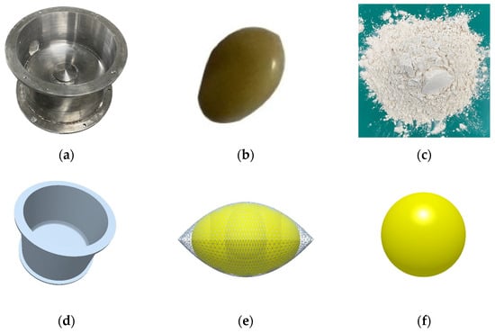 Visual representation of the constructed model: (a) Coating pot; (b) Red clover; (c) Powder; (d) Coating pot model; (e) Red clover model; (f) Powder model.