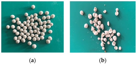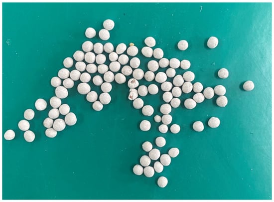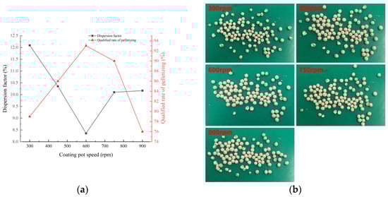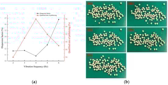 As shown in Figure 8, the vibration frequency of the coating pan exhibits a decreasing trend followed by an increasing trend in the dispersion coefficient, and an increasing trend followed by a decreasing trend in the pelletization pass rate within the tested range. Maintaining a vibration frequency of 2–4 Hz for the coating pan results in a significant decrease in the dispersion coefficient and a significant increase in the pelletization pass rate. However, as the vibration frequency continues to increase beyond 4 Hz, both the dispersion coefficient and the pelletization pass rate show a trend of increase followed by a decrease. Through comprehensive analysis, it is evident that when the vibration frequency of the coating pan is set to 4 Hz, the dispersion coefficient reaches its minimum value and the pelletization pass rate is at its highest.