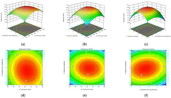 Response surface plots and contour plots of factors affecting dispersion coefficients: (a) Effect of cladding pot speed and vibration frequency on the dispersion coefficient; (b) Effect of cladding pot speed and vibration amplitude on the dispersion coefficient; (c) Effect of vibration frequency and vibration amplitude on the dispersion coefficient; (d) Contour plot of cladding pot speed and vibration frequency on the dispersion coefficient; (e) Contour plot of cladding pot speed and vibration amplitude on the dispersion coefficient; (f) Contour plot of vibration frequency and vibration amplitude on the dispersion coefficient of the contour plot.
