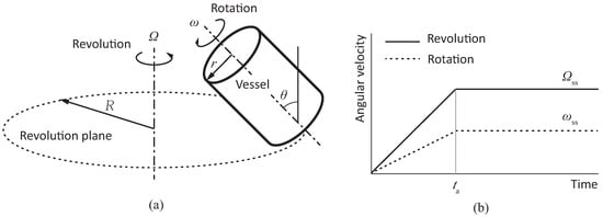A planetary mixer, as its name implies, is a device that simultaneously applies orbital and rotational motion to the mixing vessel [10]. Figure 1a is a schematic diagram showing the planetary movement of the cylindrical vessel with an inner radius of r. The axis of rotation moves in a circular motion with a radius of R in the revolution plane. The revolution speed and the rotation speed are denoted by and , respectively. The axis of rotation is generally inclined by an angle theta with respect to the axis of revolution. The specific mixer configuration of interest in this simulation study has antidirectional revolution and rotation axes with an inclination angle of 45, which is known to exhibit optimal performance [9,26,27]. The orbital and rotational motion of the vessel starts at 0 rpm from the start time to the acceleration time , as schematically illustrated in Figure 1b, and then maintains the respective steady state speeds of and . Here, the rotation-to-revolution speed ratio is defined as n = /. In this paper, a numerical analysis study was conducted on the two-degree-of-freedom planetary mixing capable of an arbitrary combination of revolution and rotation speeds. Specifically, a total of 21 simulations were conducted with a combination of seven cases of revolution speeds (150 rpm, 300 rpm, 450 rpm, 600 rpm, 900 rpm, 1200 rpm, and 1500 rpm) and three ratios of rotation-to-revolution speed (1/3, 1/2, and 1) for each revolution speed.