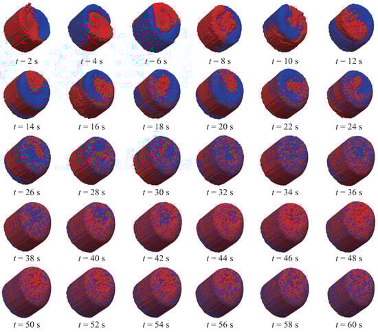 Figure 3 depicts successive post-processed images at intervals of 2 s over 60 s for Case 1 ( = 150 rpm, = 50 rpm) with the lowest rotation speed among the simulation cases listed in Table 3. In the same manner as in the image processing method of Figure 2b, epoxy part A and part B were represented by red and blue spherical particles, respectively, to visually confirm the particle flow and mixing patterns. During the first 2 s of mixing, the particles maintained contact with the initial boundary surface to some extent while exhibiting a rotational flow similar to that of a rigid body. Discernible flow patterns that penetrated each other appeared on the upper free surface after 2 s and lasted for about 10 s instead of occurring on the bottom surface. After 10 s, the two fluids started to swirl and create a twisted flow pattern, causing the particle groups that were initially connected to break apart. The connectivity of the clustered fluid particles deteriorated with material convection in a whirlwind manner after 20 s. A significant breakdown of the cluster of fluid particles occurred around 50 s into the observation, resulting in an increased level of disorder and blending.