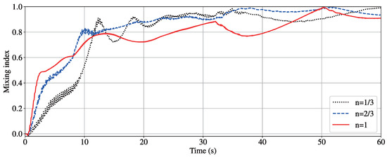 Before operating the mixer, the mixing index in Equation (10) initially had a value of 0. Once the two materials were perfectly mixed and their centers of gravity were ideally the same, the mixing index had a value of 1. If the distance between the centers of gravity of the two materials increased during the mixing process, the mixing index could result in a negative value due to centrifugal force. Figure 4 depicts the mixing index curve of simulation Case 1, Case 2, and Case 3 with a revolution speed of 150 rpm and a rotation-to-revolution speed ratio of 1/3, 1/2, and 1, respectively. Up to about 8 s, a higher rotation-to-revolution speed ratio led to an increased rate of change of the mixing index. For n = 1, which had the highest rotation speed among the three cases, the mixing index did not increase consistently. Instead, it fluctuated after 10 s, resulting in poorer mixing compared to the other two cases. A mixing index of 80% was achieved in 11 s in all three scenarios. However, the subsequent increase in the degree of mixing was typically much slower than the initial mixing stage. Based on this analysis, the centrifugal force generated by the 150 rpm speed setting appeared to be unable to efficiently and homogeneously stir the chosen epoxy resin.