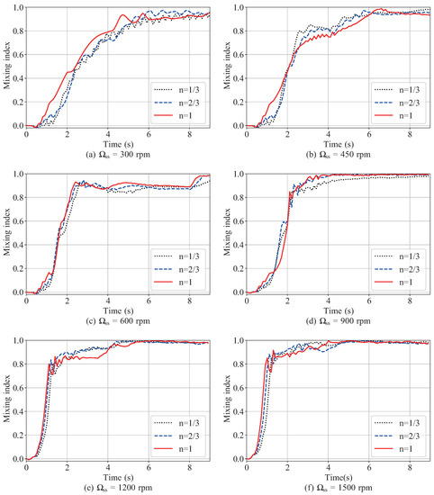 Figure 9 shows a 60% rising time bar graph extracted from the mixing index data of 21 simulation cases. At low-speed operation ( = 150 rpm), the rising time exceeded 6 s. However, it significantly improved to less than 3 s when operating at a high speed ( 300 rpm). When driving at 1200 rpm or higher, it was possible to achieve a swift rising time of approximately 1 s. When operating at = 150 rpm, the rising time increased as the rotation-to-revolution speed ratio increased. However, under high-speed driving conditions of 300 rpm, there was no overall consistent correlation between the rotation-to-revolution speed ratio and the rising time. It is imperative to select conditions where n = 1/3, because this would lead to significantly lower energy consumption when driving the rotary motor, as opposed to when n = 1/2 or n = 1.
