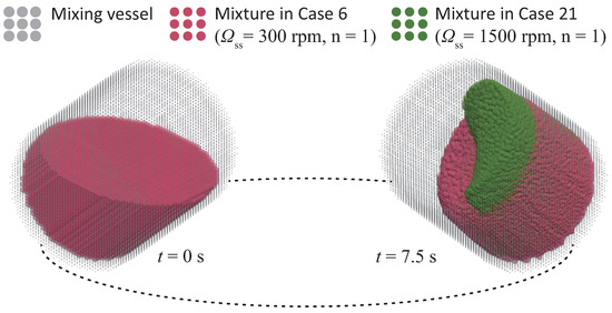 Further simulations were conducted to verify the mixing performance with the increased centrifugal forces compared to the low-speed operating conditions of 150 rpm. Eighteen simulations (Case 4–Case 21) were carried out in a range of revolution speeds of 300–1500 rpm, taking into account the range of operation speed of conventional industrial planetary mixers. Among them, the data visualization results for six cases with n = 1/3 are shown in Figure 5 at 1.5 s intervals from 1.5 s to 9 s. The thick border lines in Figure 5 indicate that the mixing vessel was in the acceleration state before reaching the steady state. Material mixing did not make significant progress during the acceleration period when < 450 rpm. On the other hand, when > 600 rpm, a noticeable improvement in material mixing was observed during acceleration. Based on the results at t = 1.5 s and t = 3.0 s, it was evident that when the revolution speed was higher, the spiral band of the fluid particles in contact with the cylindrical wall became denser and more distinct. Figure 3 shows that particle clusters separated after 50 s at 150 rpm. On the other hand, Figure 5 shows that particle segregation occurred quickly within 10 s at 300 rpm. This led to a significant enhancement in the mixing performance, depending on the operating conditions.
