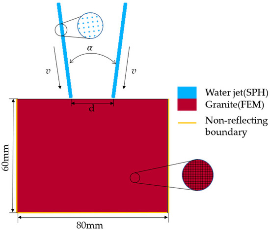 A high-pressure impact dynamics problem involving many variables, including both the high-pressure flow impact of the water jets and the stress wave response created by the rock under this effect, is the progressive fracturing of rocks by high-pressure water jets. Given the difficulty of using FEM to calculate massive deformation problems, SPH has the inherent flaws of tensile instability, difficulty enforcing boundary conditions, and low computing efficiency [17]. Because of the advantages of large deformation under SPH and high computational accuracy and efficiency under FEM, the coupled SPH-FEM algorithm was used here to simulate the process of rock fracture fragmentation. This allowed us to not only obtain greater precision in rock damage characteristics but also to better simulate the large instantaneous deformation and high strain rate in the impact process.