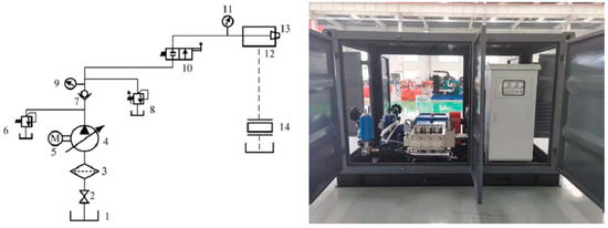 Schematic diagram of the test equipment: (1) water tank; (2) stop valve; (3) filter; (4) high-pressure pump; (5) motor; (6) safety valve; (7) check valve; (8) relief valve; (9) pressure gauge; (10) reversing valve; (11) pressure gauge; (12,13) testing platform; (14) recovery filter.