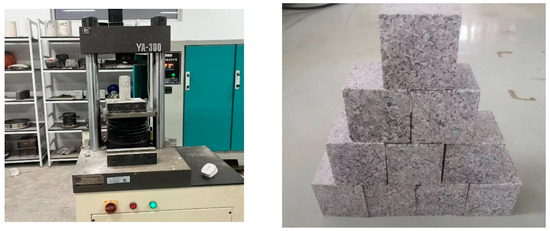 The rock specimens used in this paper were all cuboid blocks of 10 cm × 10 cm × 10 cm made from collected natural rocks. The prepared rock specimens were cored, and the obtained core end faces were polished so that the upper and lower end faces were parallel to each other and perpendicular to the core axis, and a cylinder with a diameter D = 50 mm and a length L = 150 mm was made. The compressive strength of the specimen was as follows: