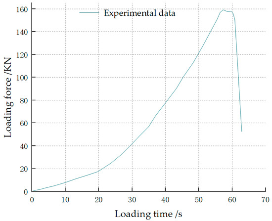 YA-300 equipment, as shown in Figure 4, was used to test the uniaxial compressive strength of the rock specimen, and the failure load measured on the rock specimen is shown in Figure 5. The uniaxial compressive strength of the prepared rock specimen was calculated to be approximately 81 MPa by substituting the peak value of the vertical coordinate of Figure 5 into Equation (6).