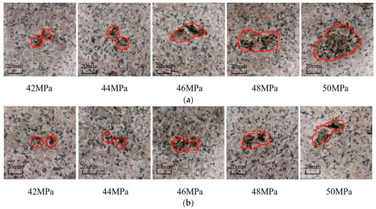 According to the analysis shown in Figure 7, it can be seen that the damaged areas caused by the two rock-breaking methods increased with the increase in the water jet pressure. When the pressure was 44 MPa and 42 MPa, the damage pits caused by the two methods converged, which basically accords with the results of the numerical simulation. However, with an increase in the pressure, the damaged areas caused by the double water jets is obviously larger than that by single water jet. In addition, when the pressure was greater than 44 MPa, the damage to the rock caused by the high-pressure double-stranded water jet could not be distinguished from the damage edge of the impact point.