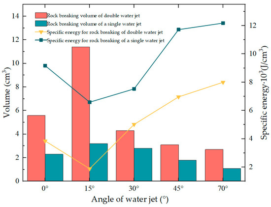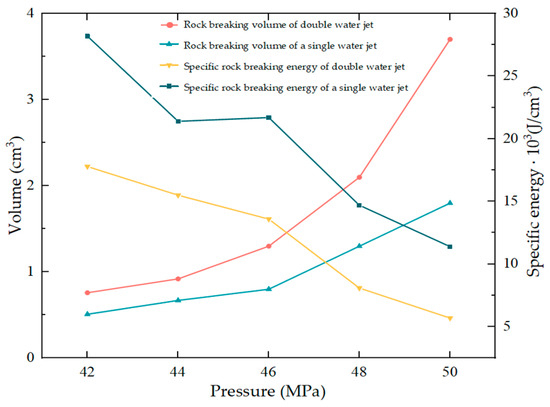 Specific rock breaking energy and volume of the water jet under different pressures.
