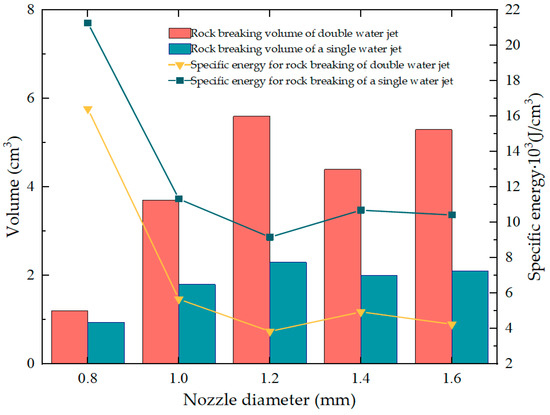 Figure 10 shows the rock-breaking volumes and specific energies of rock breaking caused by two kinds of water jets. When a nozzle with the same diameter is used, the rock-breaking volume of the high-pressure double water jets is higher than that of the single water jet. When the nozzle diameters were 1.2 mm and 1.6 mm, the ratios of the rock-breaking volumes of the front and back two ways were 2.43 and 2.52, respectively. Meanwhile, it can be seen from the figure that when the nozzle with the diameter of 1.2 mm was used, the rock-breaking volumes of the two ways were 2.43 and 2.52, respectively. The rock-breaking volume of the high-pressure double water jets reached the maximum in the test value range. The curve trend in rock-crushing specific energy reached its lowest value when the nozzle diameter was 1.2 mm. In this case, the actual rock-crushing specific energy of the high-pressure double water jets was 40% of that of the single water jet, but the rock-breaking volume was 2.43 times that of the latter.