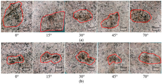 The impact angle of the water jet is also an important factor affecting its rock-breaking effect, so the included angle between the axial direction of the two water jets was defined as . In this section, rock-breaking tests were carried out for the impact angle of the high-pressure double-stranded water jet. The pressure of the water jet system was set as 50 MPa, the diameter of water jet nozzle was set as 1.2 mm, and the impact angles were set as 0°, 15°, 30°, 45° and 70°. The other parameters were unchanged.