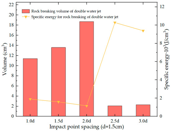 As shown in Figure 14, the rock damage volume at the 2.0 d interval was the largest, and the corresponding required energy consumption was also the lowest. The volume of rock breakage increased first and then decreased. When the impact interval was 2.0 d, the volume of the rock breakage decreased sharply because of the weakening of the stress wave transmission. In addition, high-pressure, double-stranded water jets with large spacing can also cause damage to rocks, but because of the large spacing, the crushing effect is basically consistent with the crushing volume and shape of single-stranded water jet impinged twice with the same interval.