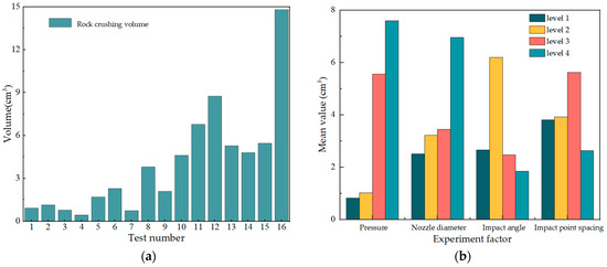 Based on the above test results, the level values of the factors with poor effects were removed. The specific orthogonal test table is shown in Table 3. The performance evaluation index used was the rock crushing volume value of each group; the larger the value, the better the parameters of this group. Figure 15a was drawn according to the rock crushing volume value of each group of tests. Since the influence trend of each factor in rock breaking could not intuitively be obtained from the group of figures, the average value of each level in Figure 15a was classified and calculated to obtain Figure 15b and Table 4.