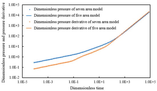- Based on the reservoir transformation characteristics of actual volume fracturing vertical wells, the volume fracturing transformation area was finely divided, and a seven-area seepage mathematical model for volume fracturing vertical wells in tight oil reservoirs was established. The pressure solution under constant production conditions and production solution under constant pressure conditions were solved using methods such as Laplace transform and Pedrosa transform. The accuracy of the model was verified using analytical and numerical simulation methods, respectively.