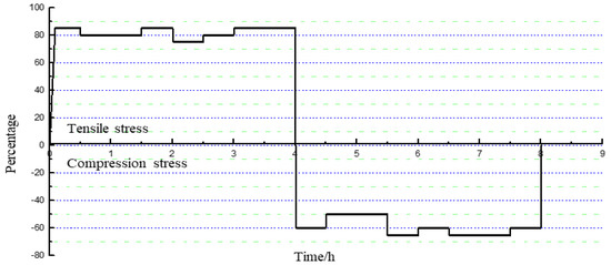 In a gas storage facility located in the western region, the injection-extraction tubular column used was of Φ114.3 × 6.88 mm specification and made of P110-grade tubing. During the injection-extraction operations, the tubular column experienced maximum tensile loads equivalent to 80% of its yield strength and maximum compressive loads amounting to 60% of its yield strength. In order to analyze the impact of operational fluctuations on the tubular column, a cyclic load test was designed using the MTS testing machine. The test was conducted with a loading rate of 5 MPa/s. The tensile stress during each cycle fluctuated between 75% and 85% of the yield strength with a sustained duration of 4 h. Similarly, the compression stress during each cycle varied between 55% and 65% of the yield strength and was also maintained for 4 h. Considering the alternating tensile and compressive stresses in this experiment, based on the calculation and analysis of material mechanics stability, a standard specimen with L0 = 5d0 was selected. This can ensure that no instability failure occurs during the application of compressive loads under alternating tensile and compressive conditions. Specimen fabrication and a photograph are shown in Figure 1, and the loading process within one load cycle is illustrated in Figure 2.