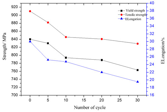 These alterations lead to the degradation of oil casing materials’ strength, subsequently diminishing the service strength of the string. For instance, tests conducted after 30 weeks of injection and production operation in a gas storage unit confirmed a 9.2% decrease in the yield strength of the injection and production string (Figure 3). This led to a 9.20% reduction in tensile strength, a 9.30% decrease in internal pressure strength, and a 5.46% reduction in the collapse strength of the injection and production string (Figure 4). Furthermore, the casing material strength of a tight oil well demonstrated signs of weakening during multi-stage fracturing. After 30 fracturing operations, the tensile strength, internal pressure resistance, and crush resistance of the 139.7 mm × 7.72 mm P110 fracturing casing string decreased by 5.0%, 5.0%, and 2.43%, respectively (Figure 5).