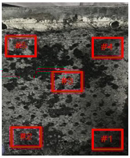 Integral Slime Anode Plate Sealed by Epoxy Resin. The sampling regions of the experimental samples from the silting area for mm-XRF analysis are labeled as 1# to 5#.