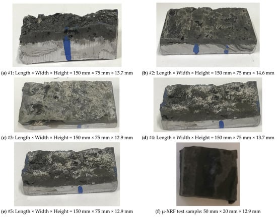 Five groups of parallel samples were taken from the large silting area. The sampling location can be found in Figure 2, and the specific dimensions of the sample are shown in Figure 3. Each sample was fed from the front and outside of the anode slime to polish the anode slime powder layer by layer. The powder from the plate surface was collected at this time until the Pb base was seen. The average number of polishing cycles per sample was 20 times. By using mm-XRF, the measurement method was set to the fundamental parameter (FP) method: the measurement time was 10 s, each sample was tested 3 times, the average value was taken and the relevant chart was drawn.