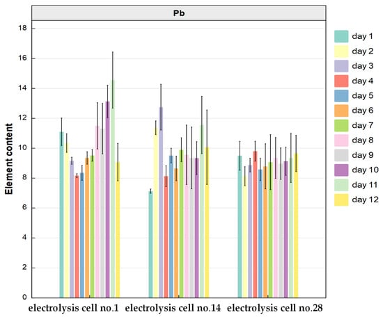 Figure 5 shows that in Electrolysis cell No. 1, the Pb content in anode slime decreased from 11.1% on the 1st day to 8.17% on the 4th day, gradually increased to 14.56% on the 11th day, and then decreased to 9.07% on the12th day. In Electrolysis cell No. 14, the Pb content in anode slime increased rapidly to 12.75% in the first 3 days, and then it generally remained at 9–10%, except for on the 11th day, when it reached 11.56%. In Electrolysis cell No. 28, the Pb content had no obvious fluctuations with time, and remained at 8–10%.