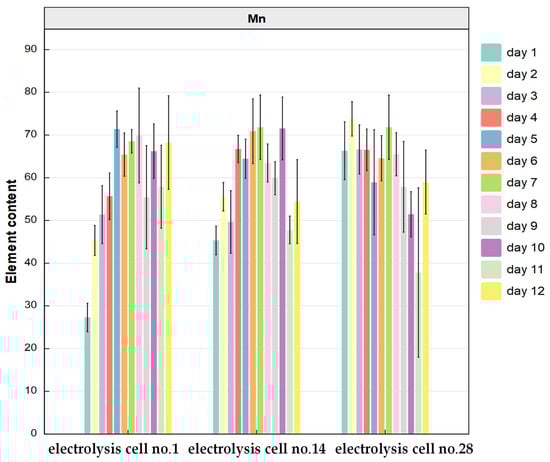 Figure 6 shows that in Electrolysis cell No. 1, the Mn content in anode slime rapidly increased to 71.39% during the first 5 days, and then fluctuated between 55% and 71%. In Electrolysis cell No. 14, the Mn content in anode slime gradually increased to 70.88% during the first 6 days, and then decreased gradually, except on the 10th day. In Electrolysis cell No. 28, the Pb content was stable at first and then decreased gradually with time, except on the 2nd and 7th days.