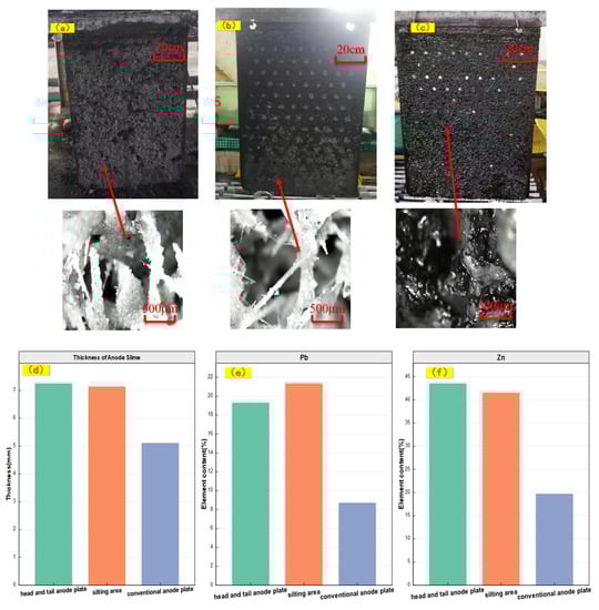 Although the surface elemental composition of the anode mud reveals a complex morphology, we observed that the head and tail plates in an electrolysis cell were prone to siltation, and some plates in other areas of the electrolysis cell also had siltation at the bottom of anode plates. In this experiment, six head and tail plates were sampled, and five anode plates were partially silted, about 15% of the total anode plates were silted. Figure 8a shows a head and tail silting plate with a partial enlarged view; Figure 8b is a partially silted plate with a partial enlarged view and Figure 8c is a conventional anode plate with a partial enlarged view. The average slime thickness, surface Pb content and surface Zn content of the head and tail silted plates, other silted plates and the remaining plates are shown in Figure 8d–f. The thickness of anode slime on the head and tail plates at 12 days was close to that of other silted plates, which were all approximately 70 mm, while the average thickness in the conventional area was approx. 50 mm. The micro-morphologies of the head and tail plates and other partially silted anode plates were also very similar. Under the microscope, at 160 times magnification, a large number of sulfate crystals were found on both plates, but the amount of sulfate crystals on plates in conventional areas was far less than on those in the other areas. The surface mm-XRF data showed that the Pb and Zn contents in the head and tail plate and the silting area were higher than those in the conventional area. This was due to the loose and porous α-MnO2, while heavy metal ions were more easily absorbed in SS and slime at the bottom of the electrolysis cell []. Under the action of the electrolyte flow field in the electrolysis cell, electrolytes and Pb impacted these areas more frequently, thus making them thicker and the contents of sulfate crystals of Pb and other metals higher. It can be seen that the physical and chemical morphologies of the head and tail plate and the silting area are almost the same; therefore, it is necessary to further analyze their differences from the anode slime in the conventional area, to guide the its treatment.