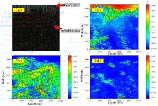 There is no recognized chemical description in academic circles for the heterogeneous and complex Pb-containing porous layer or the impurities formed on the anode surface []. In the process of industrial production, the source of anode slime cannot be accurately classified [], but in the research of this topic, academic circles believe that the chemical reactions on the anode surface of Zn electrolysis have a defined sequence that can inform classification. At the initial stage of electrolysis, the oxide layer of anode is mainly composed of Pb compounds, and then Mn dioxide is gradually attached to it.The interlayer crack and brittleness of Mn dioxide causes the corrosion of the anode plate surface by electrolytes [,]. In the previous research, we found that the anode slime of industrial systems has a boundary inflection point for the content distributions of Pb and Mn, and we proposed a specific location range of the film-slime layer []. For the purpose of film preservation and slime removal, most of the elemental Pb can be retained on the original anode plate by using intelligent slime removal equipment according to the inflection point of the membrane slime interface. If there is a need for further evaluation and resource utilization of anode slime, and specifically, the relative elemental contents of Mn, Pb and Zn, the mechanism of anode slime formation on anode plates and the distribution law of elements and thickness should be researched.
