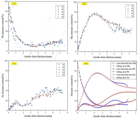 As shown in Figure 11, Figure 11a shows the relationship between five groups of Pb content and anode slime thickness in the silting area, Figure 11b shows the relationship between five groups of Mn content and anode slime thickness in the silting area and Figure 11c shows the relationship between five groups of Zn content and anode slime thickness in the silting area. After removing a small amount of data outside 7 mm of the silting area and adding previous research data on conventional anode slime from the same enterprise, the data on Pb, Mn and Zn were fitted to obtain the relationship between the Pb, Mn and Zn contents in anode slime as well as the thickness of anode slime in the silting area and the conventional area, as shown in Figure 11d.