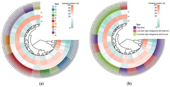 (a) Cluster Heatmap Analysis of Main Element Contents in Anode Slime. (b) Cluster Heatmap Analysis of Main Element Content of Anode Slime Based on Enterprise Demand.